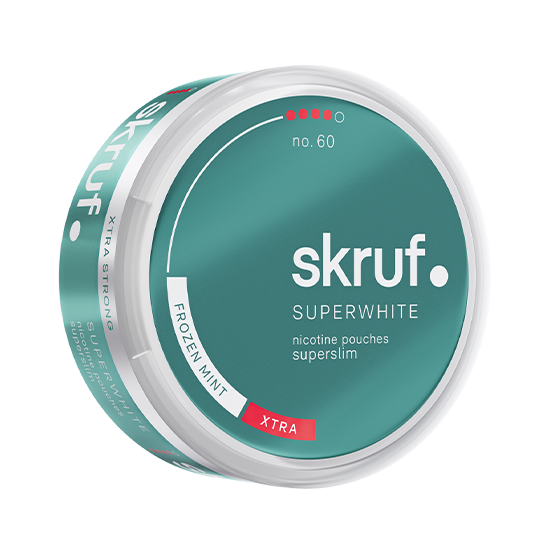 Experience an intense and refreshing nicotine experience with Skruf Superwhite No.60 Frozen Mint Superslim Xtra Strong – a tobacco-free nicotine pouch from Skruf Snus. As part of the Skruf Super White series, this product is designed in a superslim format for a discreet and comfortable fit under the lip. With an extra strong nicotine content, it provides a powerful kick without any tobacco.