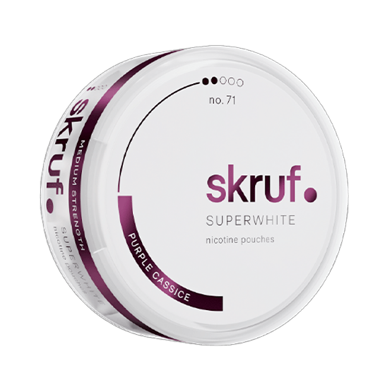 Skruf Superwhite No.71 Purple Cassice is a white snus with the flavor of black currants. The strength is classified as normal, with a nicotine content of 6 mg per portion and 8 mg per gram.